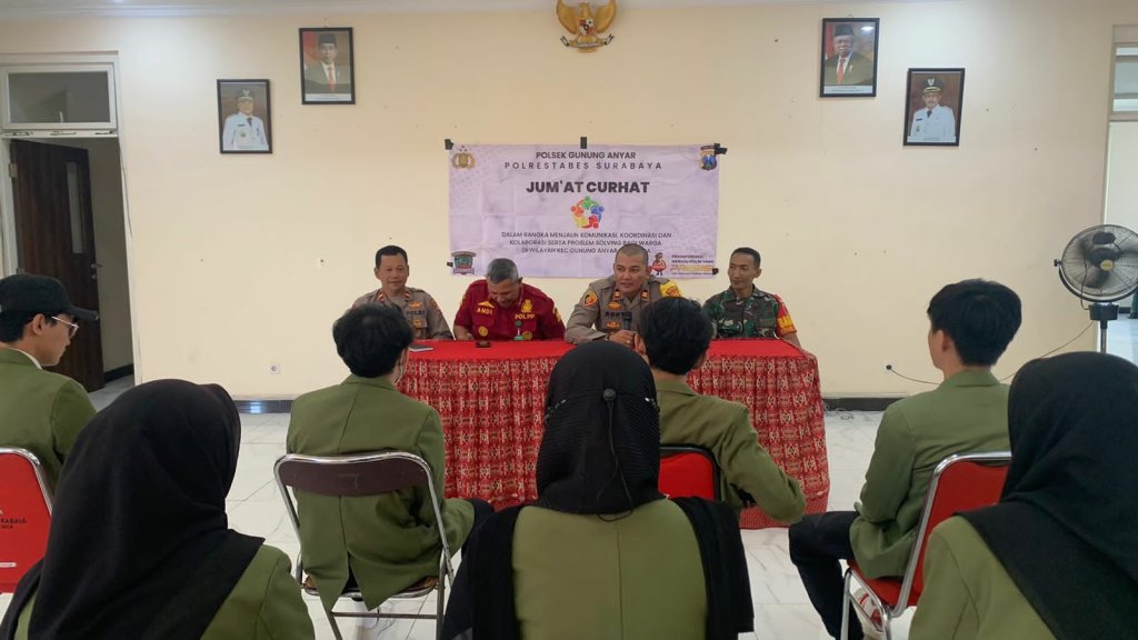 Surabaya,Surya Mentari – Polsek Gunung Anyar bersama dengan 3 Pilar Gunung Anyar melaksanakan Kegiatan Jumat Curhat (Curahan Hati), bersama Mahasiswa UPN di Kantor Aula Kecamatan Gunung Anyar Surabaya.