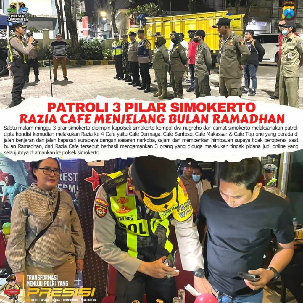 Kapolsek Simokerto Kompol Dwi Nugroho menyatakan ” kegiatan tersebut untuk mengantisipasi Tindak Kejahatan seperti Tawuran Antar Gengster,Balap Liar dan Tindak Kejahatan Lainnya serta akan memberikan Himbauan kepada pemilik Cafe agar tutup di bulan suci Ramadhan tersebut di wilkum Polsek Simokerto. Ungkap Kapolsek Kompol Dwi Nugroho dan Camat Noervita Amin (SM)