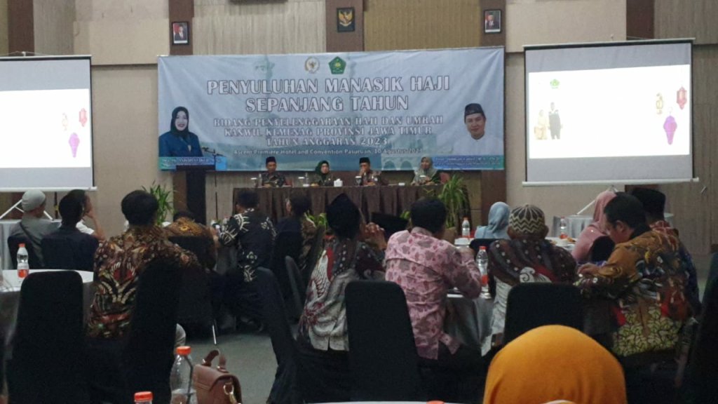 Surabaya, Surya Mentari – Jika sebelumnya Kementerian Agama Provinsi Jawa Timur (Kemenag Jatim) identik dengan Kegiatan JAMARAH dan Sapa Jamaah Haji di tahun 2022, maka tahun 2023 ini instansi dibawah kepemimpinan Husnul Maram Fokus melangsungkan Penyuluhan Manasik Haji Sepanjang Tahun 2023. Untuk kali pertama, angkatan I digelar di Hotel Ascent, Pasuruan. Tepatnya Kamis, 10 Agustus 2023, Kemenag Jatim menghadirkan narasumber anggota Komisi VIII DPR RI, Dra. Hj. Anisah Syakur dan dari Kemenag Jatim, hadir Kepala Bidang Penyelenggaraan Haji dan Umrah Kanwil Kemenag Prov. Jawa Timur Dr. Abd. Haris Hasan, M.Pd.I.